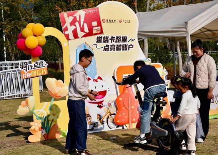 本次嘉年华现场,招商银行合肥分行以“燃烧卡路里 点亮碳账户”为主题,精心策划了互动体验环节。参与者通过骑行发电装置,将运动能量转化为“绿色能量”,点亮象征低碳生活的招财卡,生动传递了绿色出行、节能环保的生活理念。这一创意互动吸引了众多市民驻足参与,在趣味体验中增强了对碳减排行为的认知与认同。